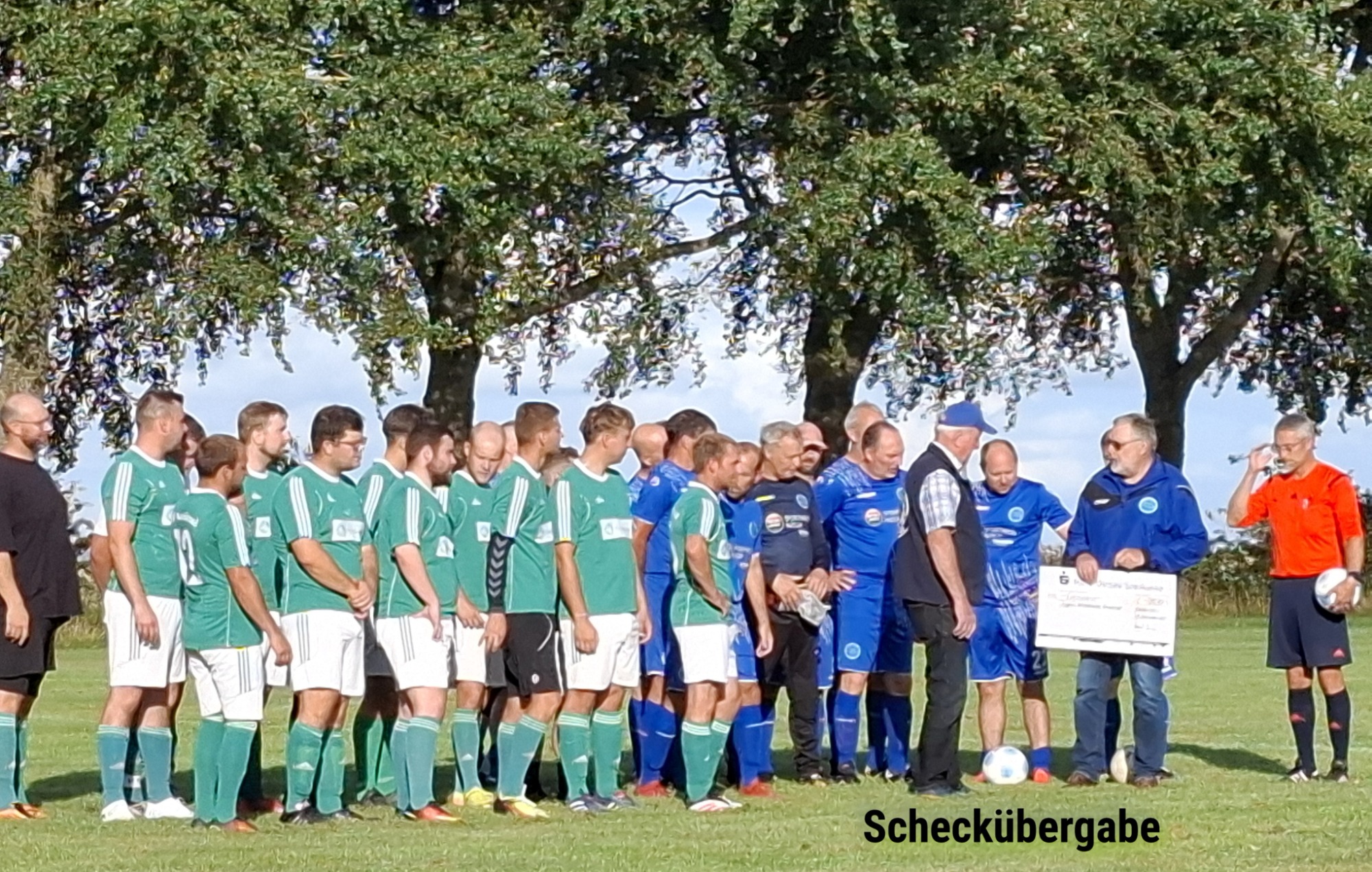 Vor dem Spiel überreichte Rainer Bruns, der Teamchef des NF-Oldie-Star-Teams, dem 1. Vorsitzenden der Schützengilde Claus Colpien zu diesem Zweck einen Scheck über 1.000,00 €